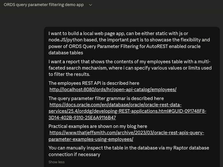 I have an Oracle AI Database (26ai, but 19c, 21c, or 23ai would also be fine.) I have Oracle REST Data Services (ORDS) 25.4. I have a table, EMPLOYEES. It is registered for ORDS, to enable the AutoREST feature.