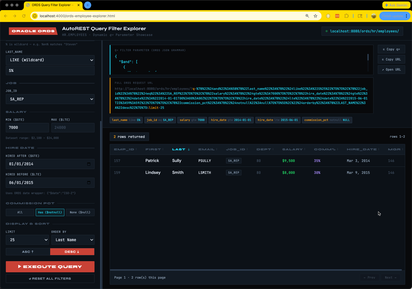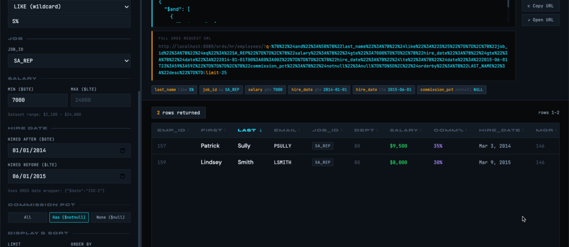 My app lets me toggle/input filters and sorting criteria, and it pretty prints the QBE JSON, and previews the complete ORDS URL for the GET request.