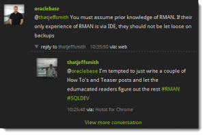 In rman2 March 29, 2012 1 Min Read Twitter oraclebase RMAN oracle Author thatjeffsmith I'm a Distinguished Product Manager at Oracle. My mission is to help you and your company be more efficient with our database tools. Website Related Posts Write A Comment Cancel Reply Save my name, email, and website in this browser for the next time I comment. you MUST enable javascript to be able to comment Δ