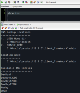 In show-tns October 9, 2020 1 Min Read Author thatjeffsmith I'm a Distinguished Product Manager at Oracle. My mission is to help you and your company be more efficient with our database tools. Website Related Posts Write A Comment Cancel Reply Save my name, email, and website in this browser for the next time I comment. you MUST enable javascript to be able to comment Δ