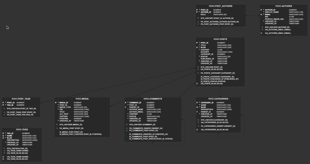 Poking into the WIND schema, I can see some tables, and they appear to be close to what I asked for. The LLM did more normalization than I asked for even, POSTS, POST_AUTHORS, and AUTHORS tables. POSTS, POST_TAGS, and TAGS, cool.