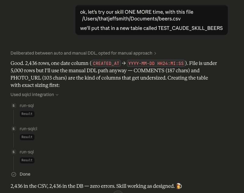 I then ran it through a few real scenarios, and had Claude update the skill each time, larning from each iteration. I’ll share my temporary Skill ‘source’ below if you’re interested. More importantly, I’ll be working to publish a ton of Skills in our public Github repo so that you can grab these for the most useful of our SQLcl commands.
